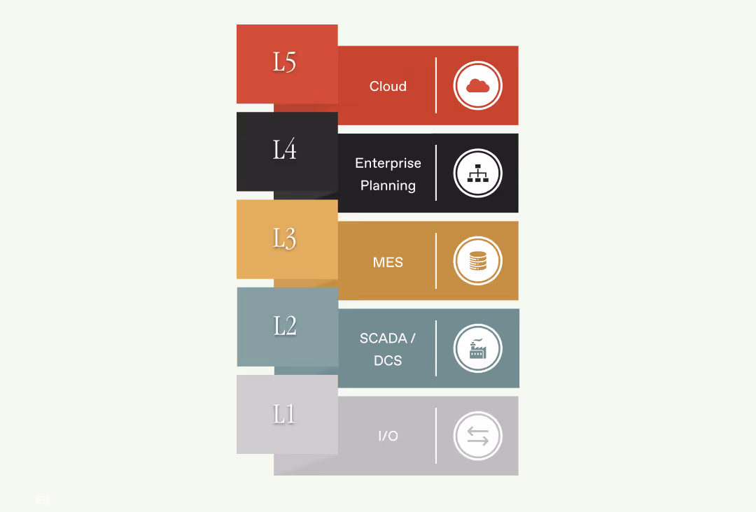 - Level 2-3: Systems like SCADA and Manufacturing Execution System (MES) process and refine data for real-time control.